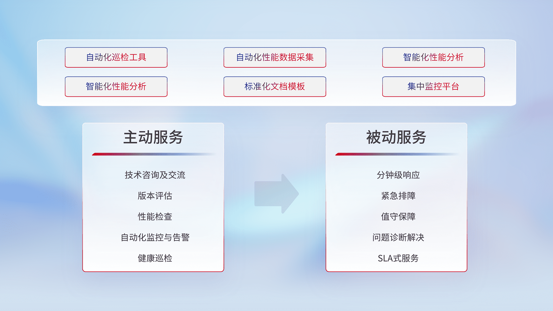 智能化工具和标准化文档,,,,保障服务质量,,提供主动服务(包含技术咨询、、、、版本评估、、性能检查、、、、自动化监控与告警、、健康巡检)和被动服务包含(分钟级响应、、、、紧急排障、、、值守保障、、、问题诊断解决、、、、SLA服务)。。