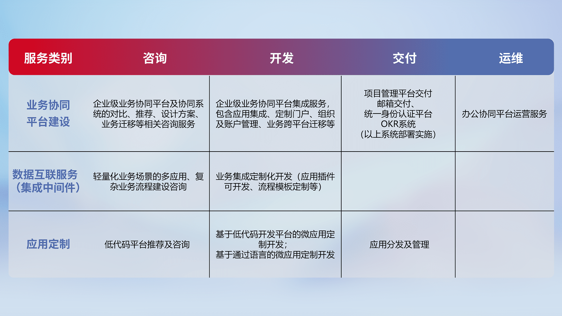 针对钉钉、、、、企微、、IDaas等平台级产品提供产品的规划、、、方案、、、、交付、、定制化开发等服务,,实现如统一协同办公、、、、智能客户服务、、、混合会议管理、、智能数据查询、、、、等业务场景,,,,实现数字化转型。。。。